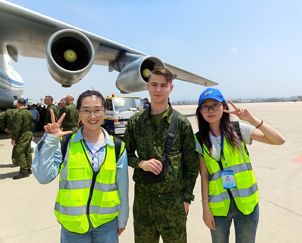 在本次接待任务中,人文社会科学学院英语专业俄语教师解凤灵担任组织协调,英语专业本科生姚连英、李松铭、郭晓峰及桑灵倩四位学生积极参与,组成专项师生服务团队。他们承担了俄语翻译及跨文化协调等任务,凭借其卓越的语言技能、沟通能力及应对突发事件的能力,确保了转机接待工作中飞机充电燃油补给、飞机维护、飞行员出入境手续办理以及必要的休息调整等事宜。
