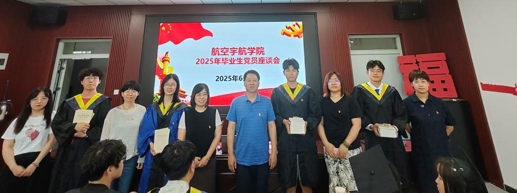 2025年6月3日下午,航空宇航学院在完成全体毕业生合影后,在学院楼310会议室举行2025届毕业生党员专题党课暨座谈会。学院党委书记罗建国、党委委员张丽花、各学生党支部书记及组织员出席会议,与全体毕业生党员49人进入深入交流。会议由张丽花老师主持。