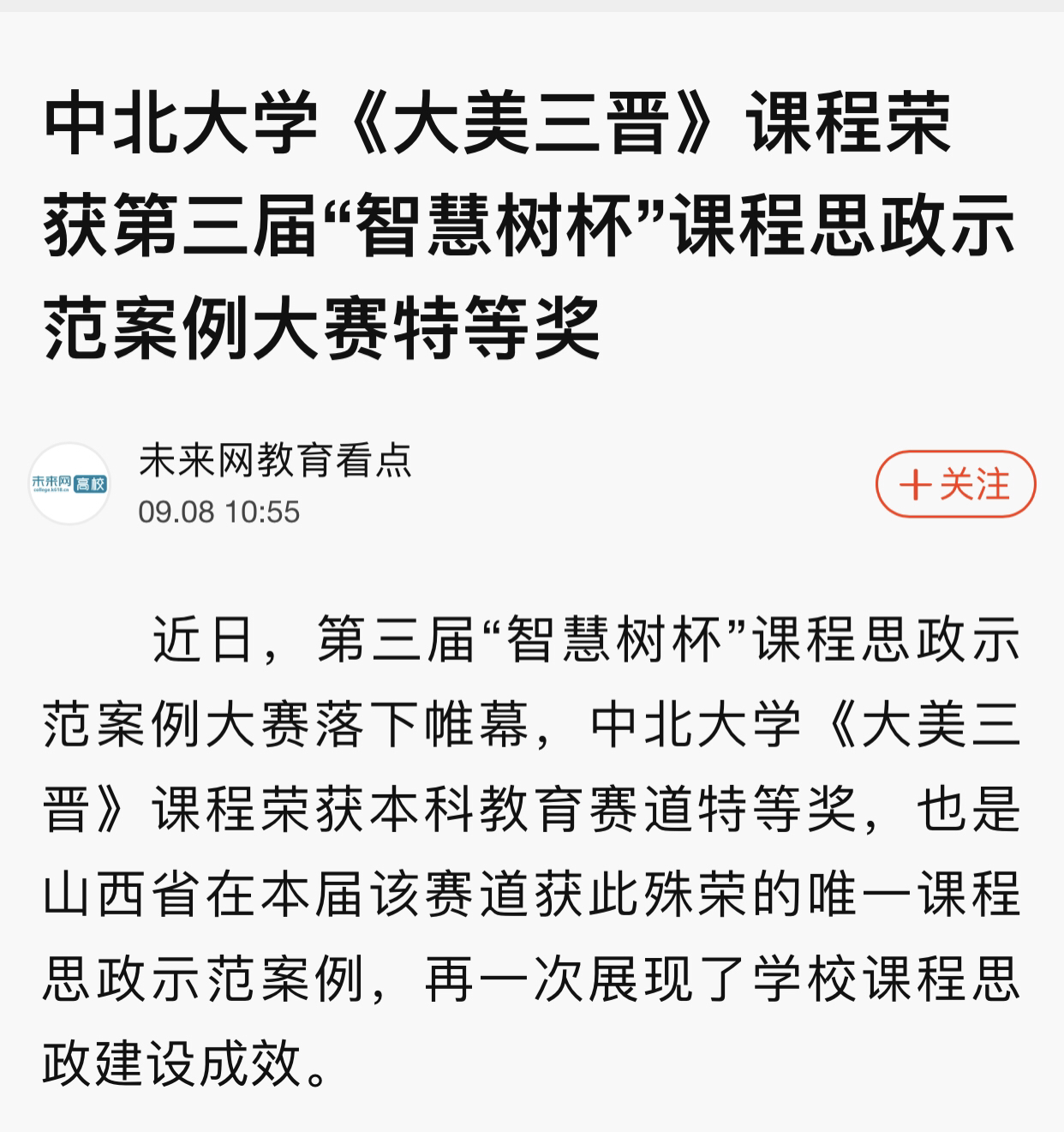 近日,第三届“智慧树杯”课程思政示范案例大赛落下帷幕,中北大学《大美三晋》课程荣获本科教育赛道特等奖,也是山西省在本届该赛道获此殊荣的唯一课程思政示范案例,再一次展现了学校课程思政建设成效。