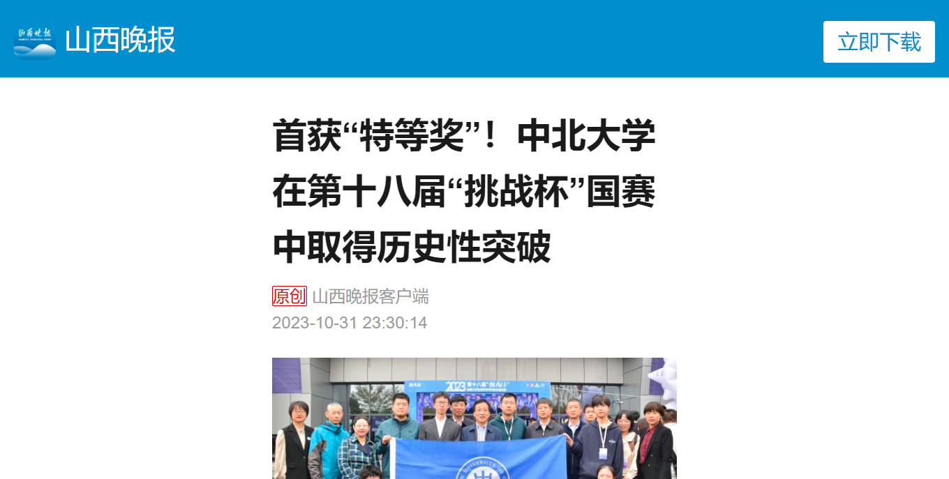 10月30日,第十八届“挑战杯”全国大学生课外学术科技作品竞赛终审决赛在贵州大学落下帷幕。在主体赛中,中北大学斩获特等奖1项,二等奖1项,三等奖3项。其中《新型集成双转子分时耦合永磁同步电机驱动系统——及其电动摩托车应用》项目荣获特等奖,这是该校历史上首次获此殊荣;《“悬鹰”——智能化主动空气悬架》项目荣获二等奖;《水凝胶——可穿戴柔性传感器先行者》《精神传承与符号嬗变——晋域文物文化的保护开发和宣发设计新路径研究》《仿生螃蟹探测机器人》项目荣获三等奖。在“黑科技”专项赛中,荣获“星系级”(特等奖)作品1件,“行星级”(二等奖)作品3件,“卫星级”(三等奖)作品3件。同时,中北大学首次在“挑战杯”大赛中捧得“优胜杯”。
