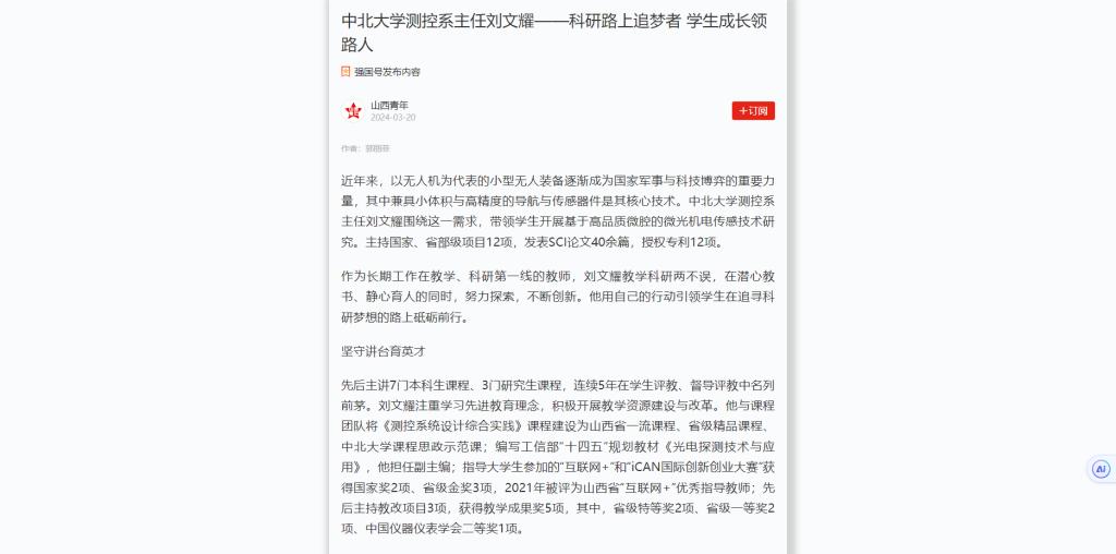 近年来,以无人机为代表的小型无人装备逐渐成为国家军事与科技博弈的重要力量,其中兼具小体积与高精度的导航与传感器件是其核心技术。中北大学测控系主任刘文耀围绕这一需求,带领学生开展基于高品质微腔的微光机电传感技术研究。主持国家、省部级项目12项,发表SCI论文40余篇,授权专利12项。