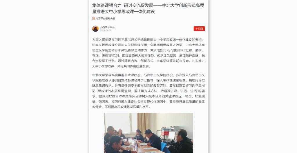 由中北大学马克思主义学院牵头,山西工学院、朔州市教育系统参与的“大中小学思政课一体化”集体备课活动以云端在线和现场备课相结合的方式生动展开。集体备课中,思政课教师按照习近平总书记提出的“术、学、道”要求,在交流与碰撞中探索思政课理论教学与实践教学的创新,探索如何提升思政课教育教学质量,探索如何善用“大思政课”,打造理论与实践有机结合的思政金课,打通“思政小课堂”和“社会大课堂”之间的壁垒,真正实现共建共治共享、共学共研共教,把大中小学思政课一体化共同体打造为各学段协同育人的命运共同体。