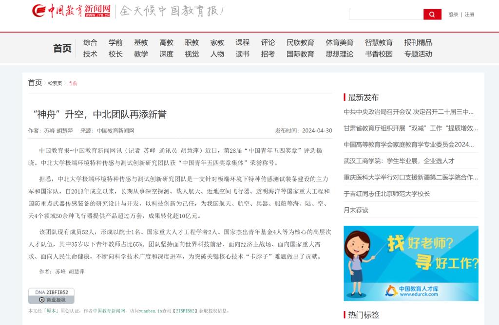 中国教育报-中国教育新闻网讯(记者 苏峰 通讯员 胡慧萍)近日,第28届“中国青年五四奖章”评选揭晓。中北大学极端环境特种传感与测试创新研究团队获“中国青年五四奖章集体荣誉称号。