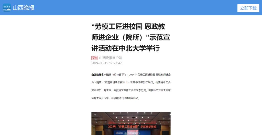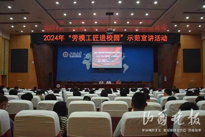 山西晚报客户端讯 6月11日下午,2024年“劳模工匠进校园 思政教师进企业(院所)”示范宣讲活动在中北大学图书馆报告厅举行。山西省总工会党组成员、副主席、省教科文卫体工会主席李忠贵,省教科文卫体工会常务副主席尹玉平,劳模嘉宾王兆麟出席活动。