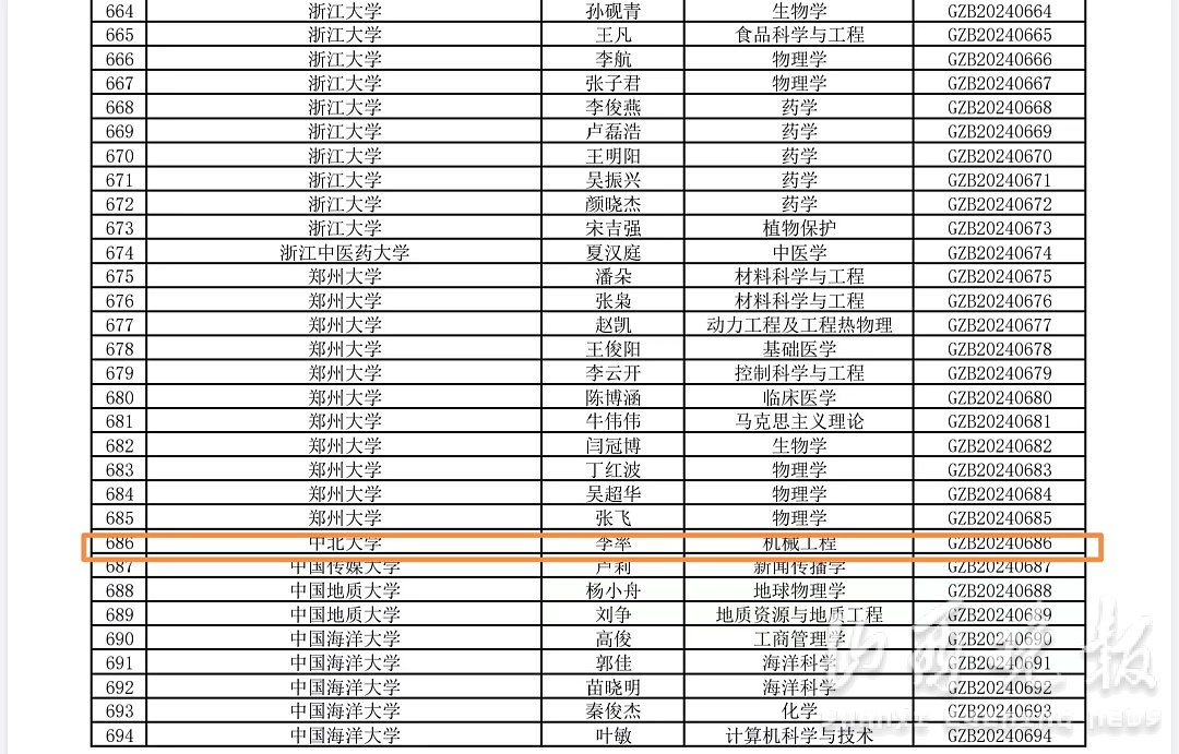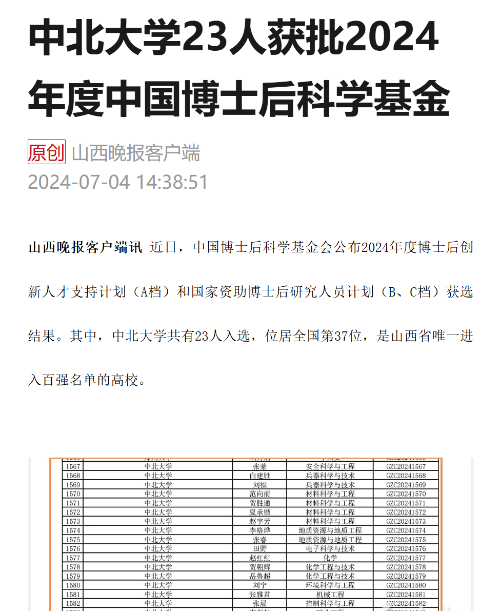 山西晚报客户端讯近日,中国博士后科学基金会公布2024年度博士后创新人才支持计划(A档)和国家资助博士后研究人员计划(B、C档)获选结果。其中,中北大学共有23人入选,位居全国第37位,是山西省唯一进入百强名单的高校。