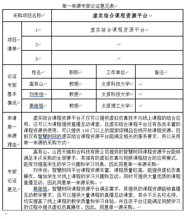 虚实结合课程资源平台不仅可以提供虚拟仿真技术与线上课程的结合应用,还可以为课程提供直播互动课堂,且虚实结合课程平台还有各类丰富的课程资源供使用,可以提供150门以上的国家级精品在线开放课程资源。经调研,目前仅有智慧树网的虚实结合课程资源平台能满足相关的服务要求,山西天瑞和合科技有限公司为智慧树网山西唯一代理商。因此申请单一来源的采购方式。
