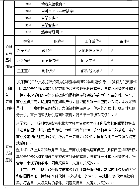 图书馆拟采购的中外文数据库资源为我校教学科研和学科建设提供了强有力的支撑作用,其涵盖的内容和涉及的范围具有不可分割的连续性和不可替代性,是广大师生获取教学、科研及学习文献资源的主要渠道。本次采购的数据库均是数据库资源提供商为该产品的唯一生产厂商或提供厂商,均拥有自主知识产权,只能从唯一供应商处采购。综合以上原因,申请该项目以单一来源方式采购。